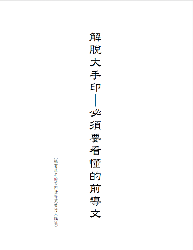 在說到《解脫大手印》之前,我首先要寫段前導文,這前導文是修學《解脫大手印》非常重要的指南,《解脫大手印》是第三世多杰羌佛親傳的佛法,是佛法中最高的佛法。第三世多杰羌佛說偈云:「今說解脫大手印,統攝八萬四千門,當場即證虹界境,換身體外悟空性」。我們從第三世多杰羌佛的四句偈中,就知道在這世界上,除了現量大圓滿和金剛換體禪等勝義最高佛法之外,根本就找不到一個時辰(兩個小時)之內成就的佛法,但是這佛法必須依宗旨而修,而佛陀師父的六言偈就是宗旨,宗旨規定「育己利他,造良樹德,諸惡莫作,眾善奉行,最勝菩提,解脫手印」。我們唸完了第三世多杰羌佛的這六句佛言宗旨,前面四句一目瞭然好理解,後面兩句必須從《解脫大手印》法本儀軌中去見真源。總之這六句宗旨徹底公告了佛陀師父在這個世界教導眾生的人生目標,宣明地透視標明了佛法在世間不離世間覺。其宗旨涵義是首先我們必須教育好自己,教育自己的目的是為了利益他人,我們要造就他人成材樹立良好的道德品質,凡是一切壞事我們都不能做,而所有對眾生有利的、一切好的我們都要做,最高殊勝的解脫成就佛法就是《解脫大手印》,因此只要我們深入《解脫大手印》讀誦思觀修學,當下就知道第三世多杰羌佛是何等至高偉大,其傳給我們的佛法是史無前例的無上妙寶。